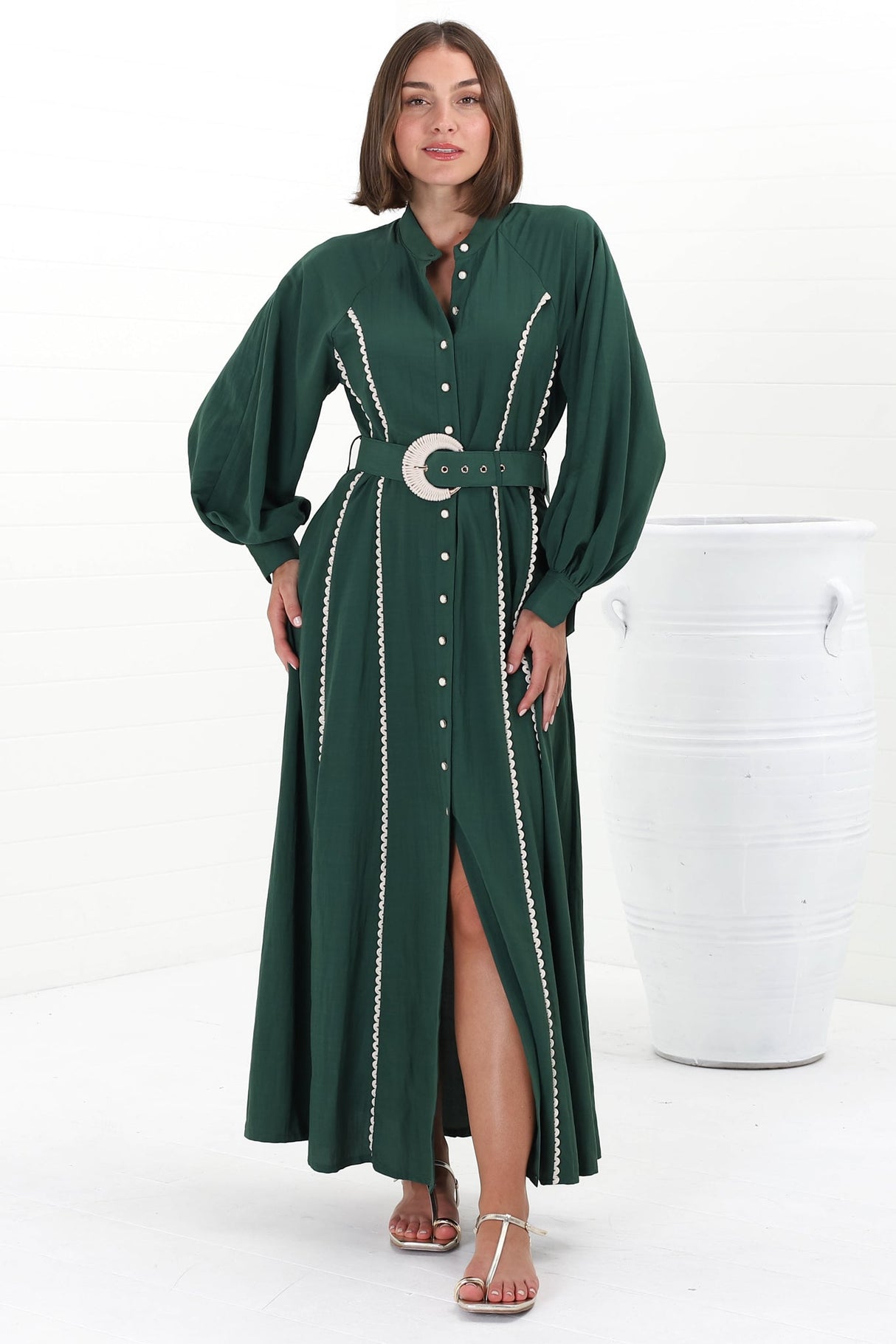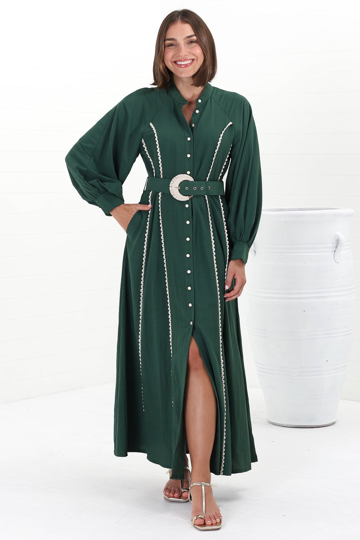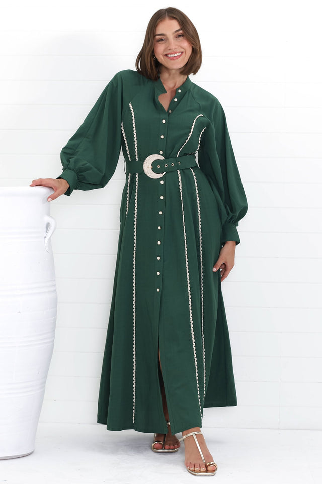 Darcy Maxi Dress - Contrast Detailing Button Down Dress with Belt in Khaki