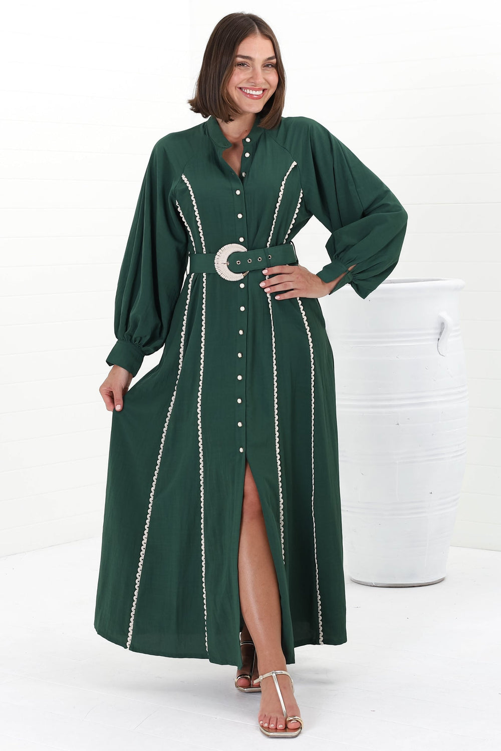 The Darcy Maxi Dress combines classic style with modern flair. Featuring chic contrast detailing and a matching belt, this button-down shirt dress offers a flattering fit and effortless versatility for any occasion.