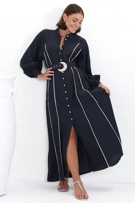Darcy Maxi Dress - Contrast Detailing Button Down Dress with Belt in Navy