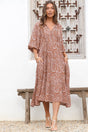 Kamali Midi Dress - Batwing Sleeve Smock Dress with Lace Detailing in Luma Print Brown