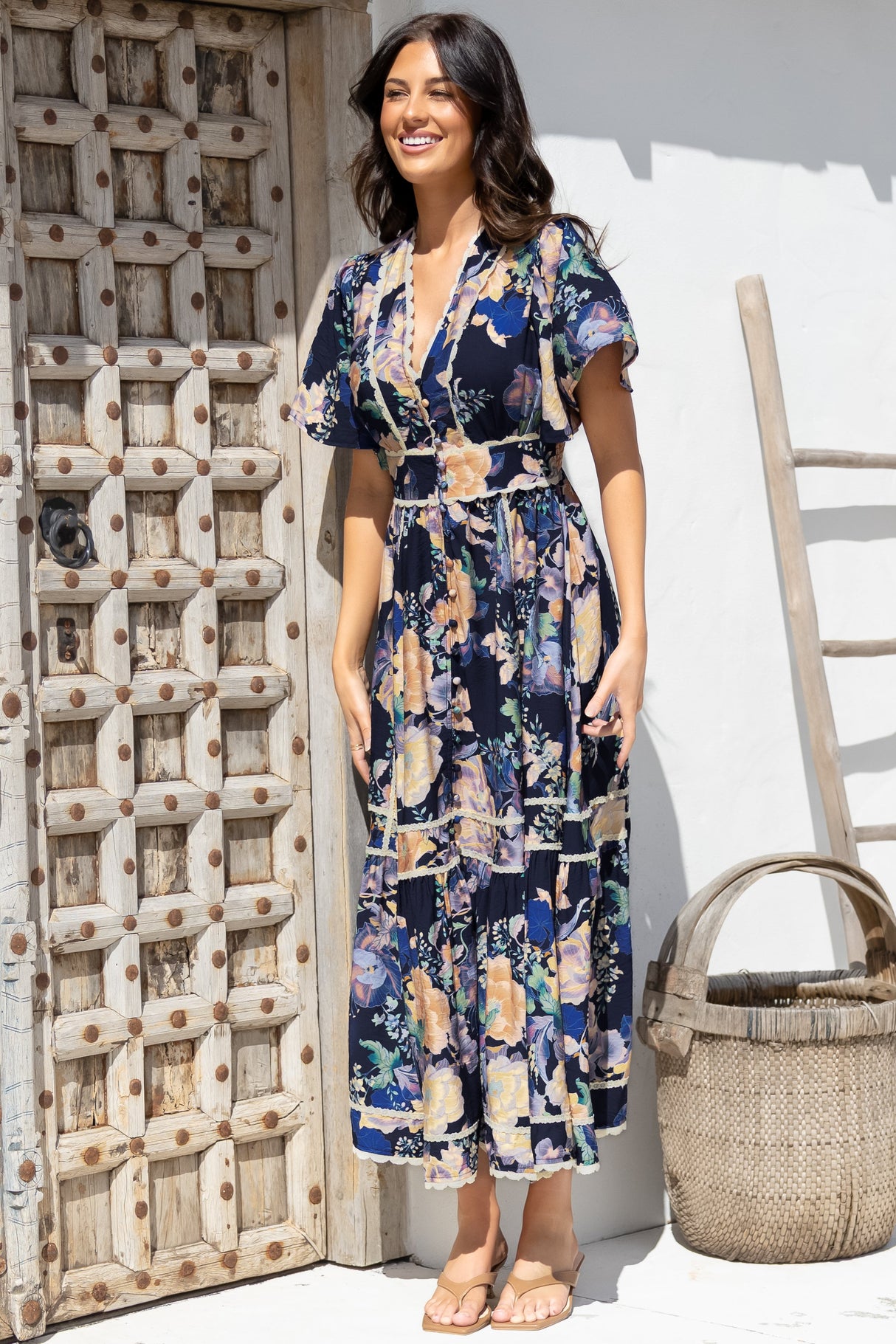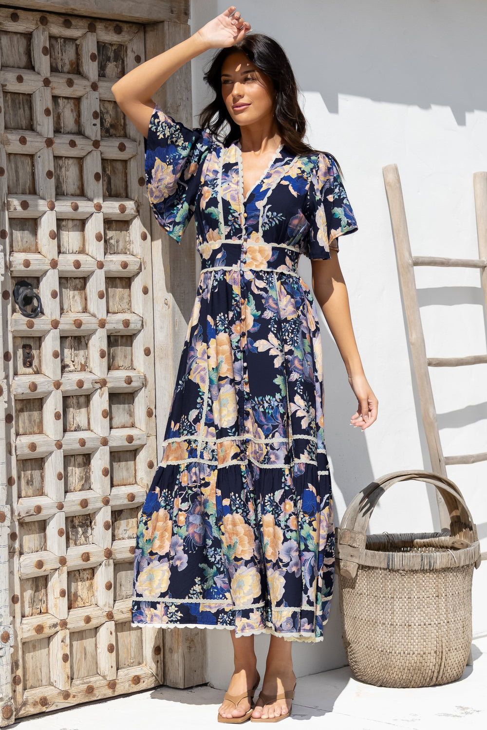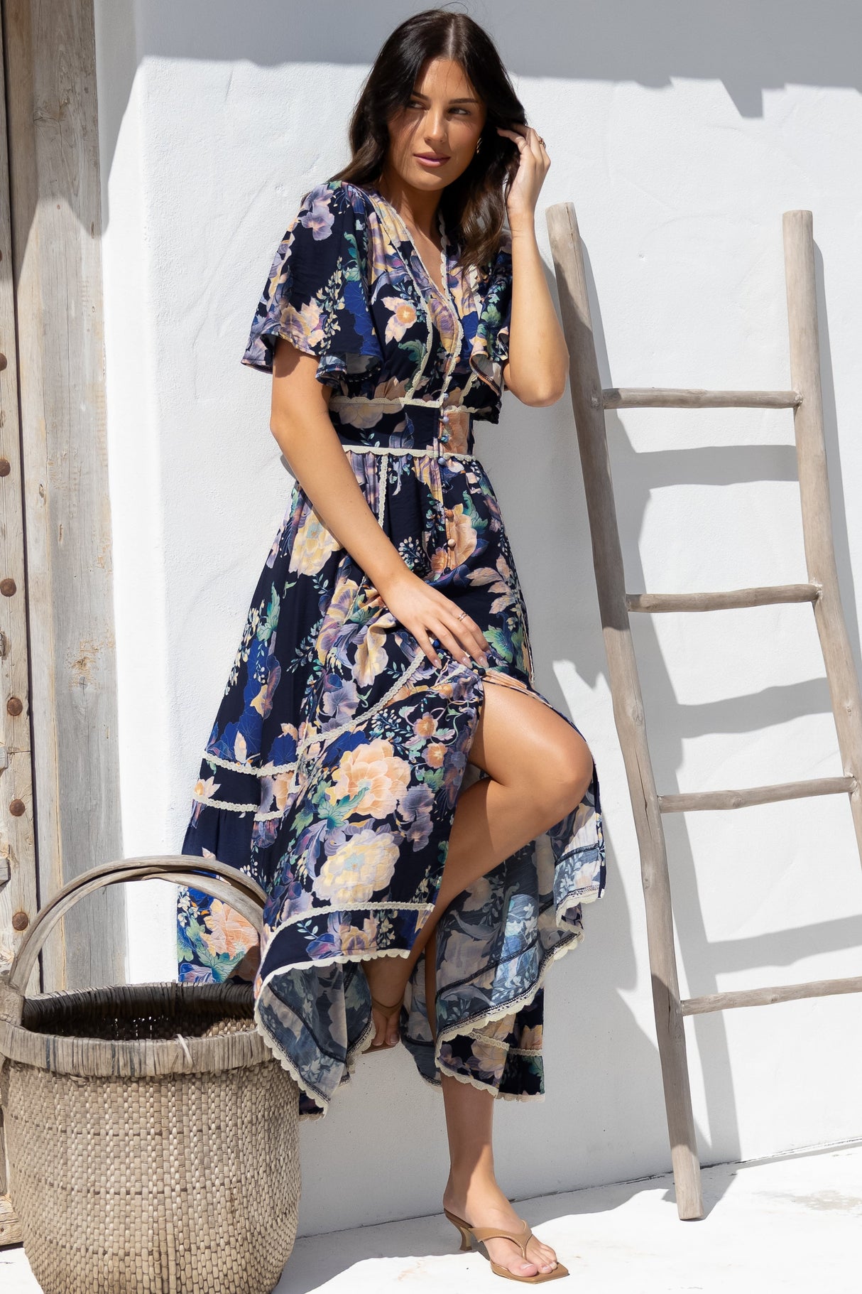 Nolette Maxi Dress - Lace Trim Button Down Dress with Flutter Sleeves in Ana Print Navy