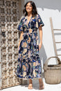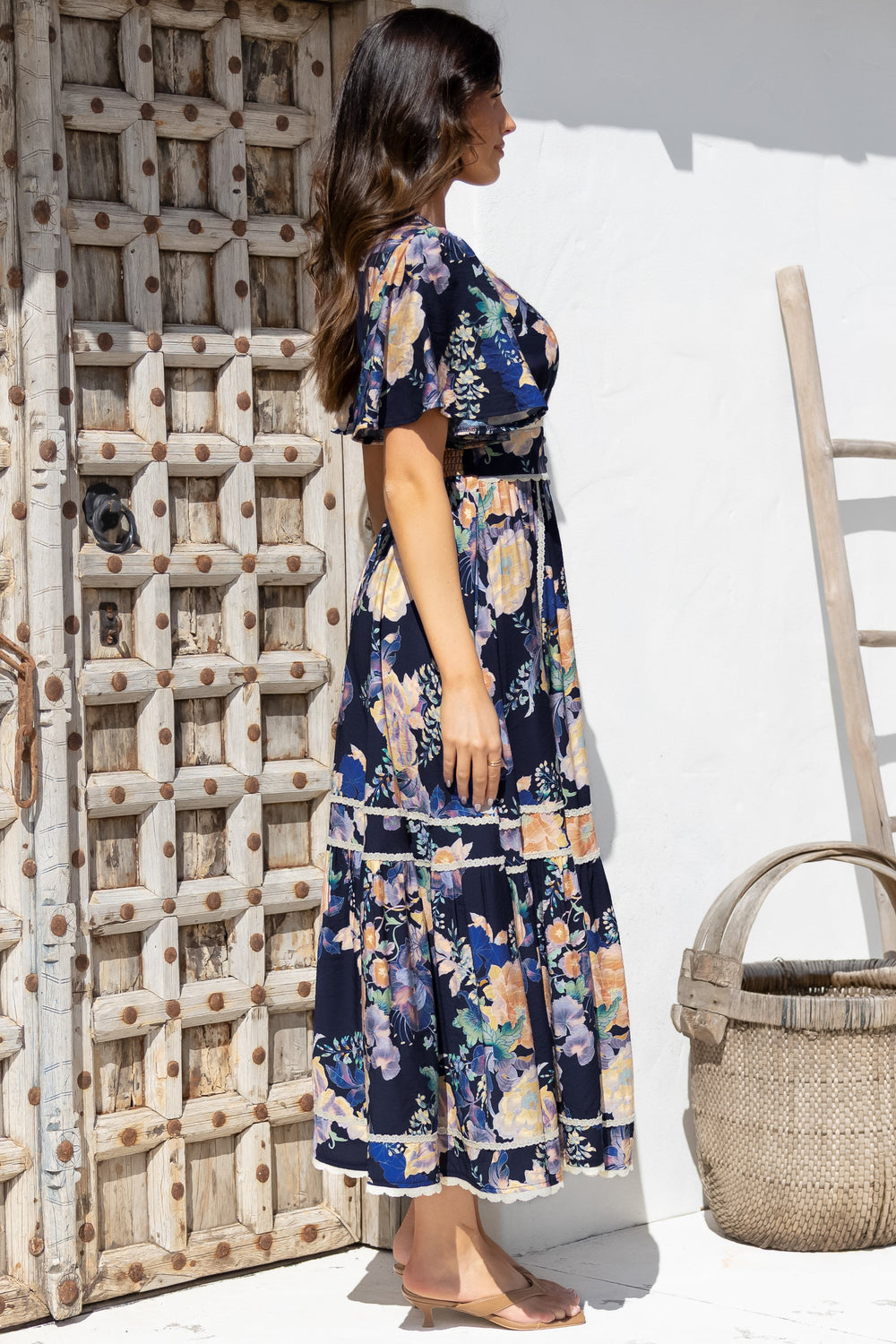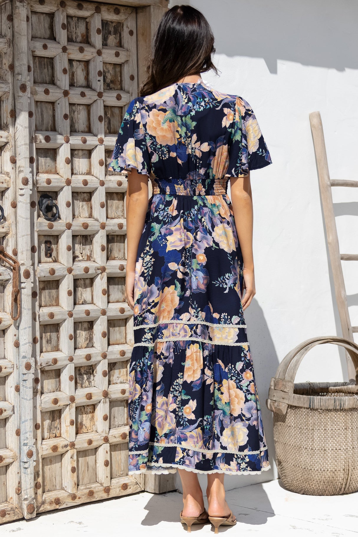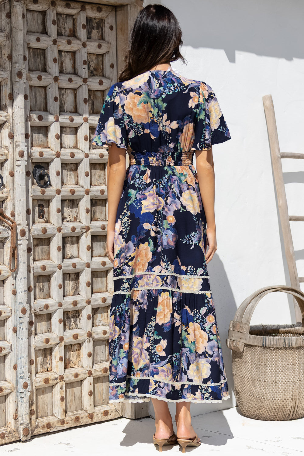 Nolette Maxi Dress - Lace Trim Button Down Dress with Flutter Sleeves in Ana Print Navy
