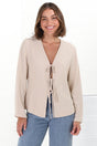 Peyton Top - Linen Tie Down Front Long Sleeve Lined Top in Beige