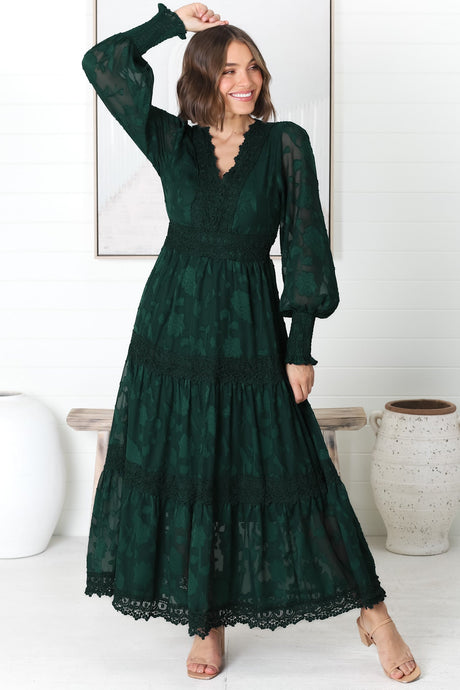Rouge Maxi Dress - Lace Overlay Tiered Dress in Emerald