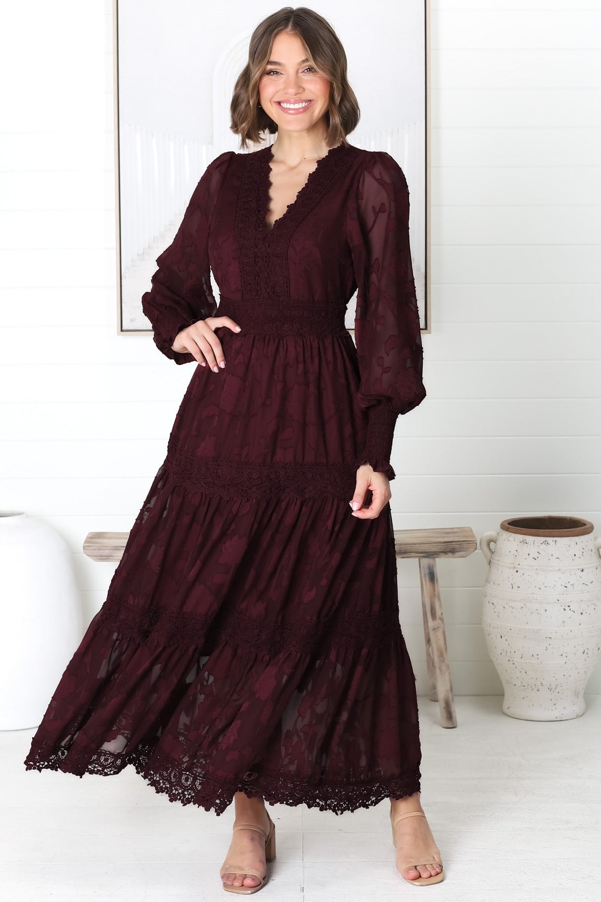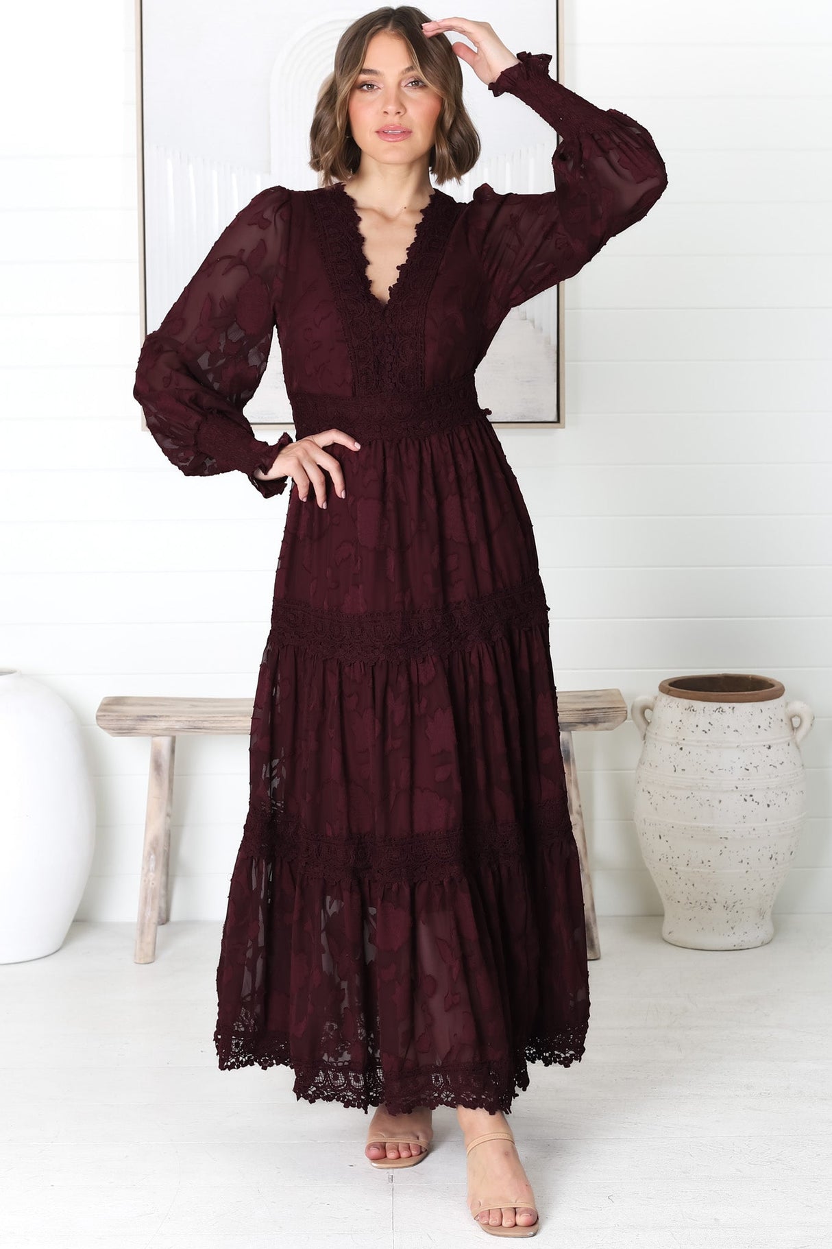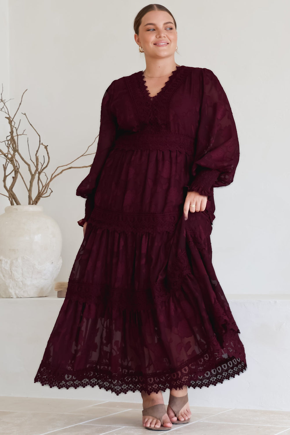 Rouge Maxi Dress - Lace Overlay Tiered Dress in Wine