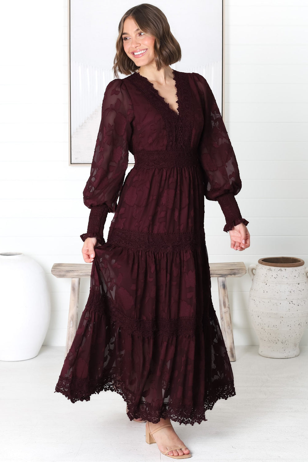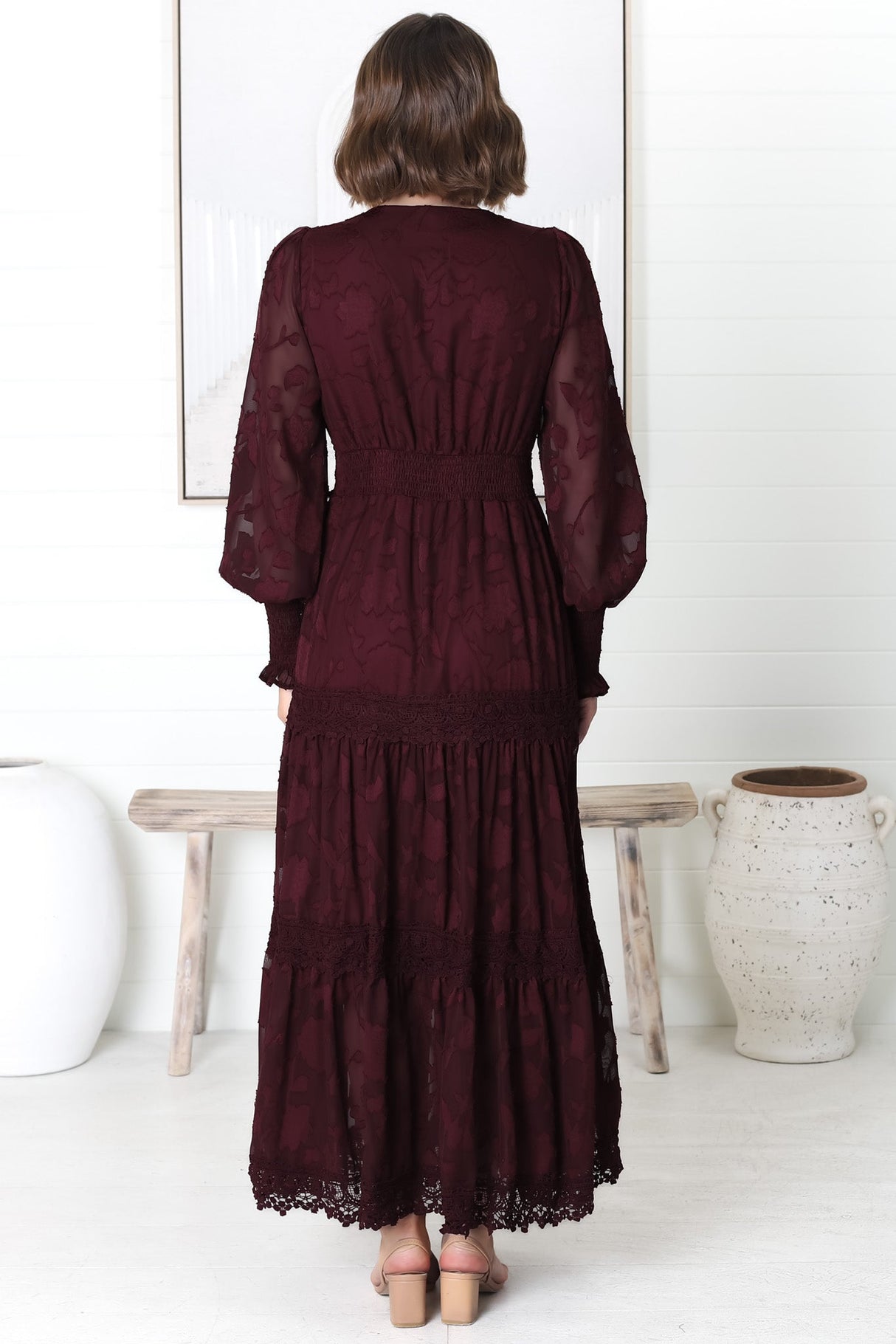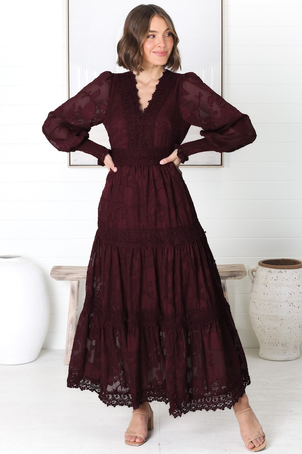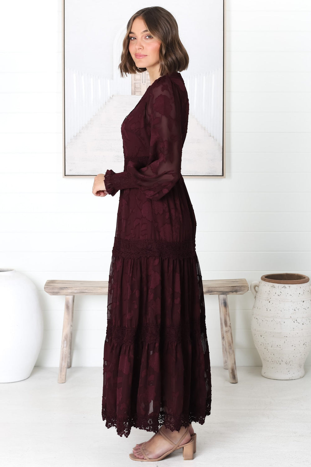Rouge Maxi Dress - Lace Overlay Tiered Dress in Wine