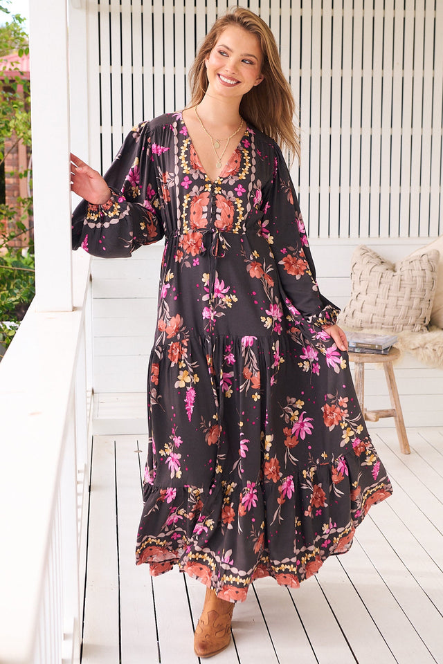 Teresa Maxi Dress - A Line Dress with Long Balloon Sleeves in Monarch Bloom Print