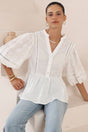 Alberta Blouse - Mandarin Collar Cut Out Embelished Balloon Sleeve Top in White