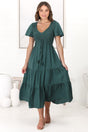 Amaya Midi Dress - Shirred Cap Sleeve A Line Dress in Emerald
