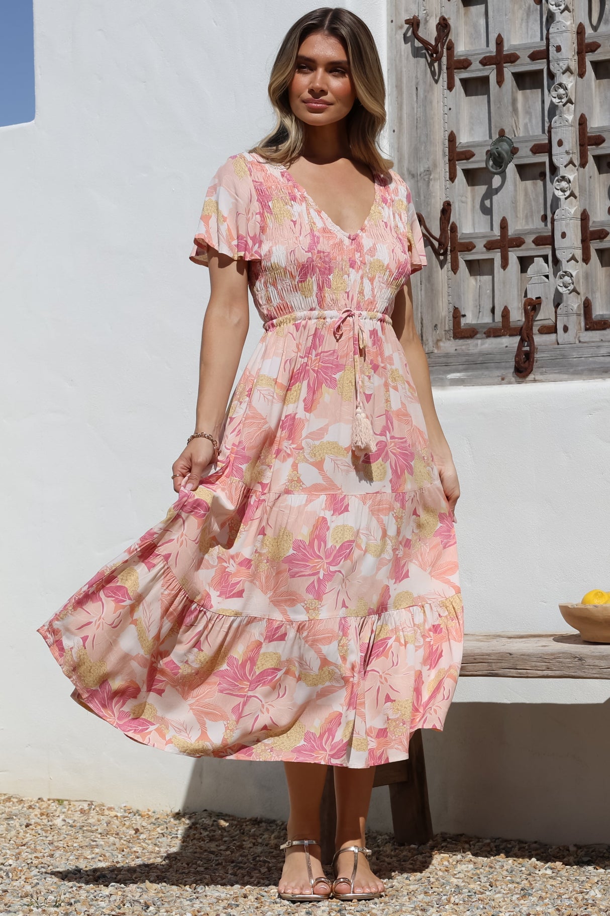 Amaya Midi Dress - Shirred Cap Sleeve A Line Dress in Marella Print Tangerine