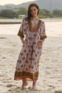 JAASE - Boheme Midi Dress: Piping Defined Bust 3/4 Sleeve Smock Dress in Grenache Print