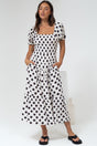 Classic yet playful, the Hush Midi Dress is a timeless wardrobe staple with a modern twist. Featuring bold chocolate polka dots on a crisp white base, this dress radiates effortless charm and vintage-inspired elegance.