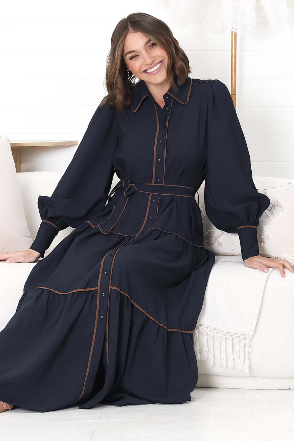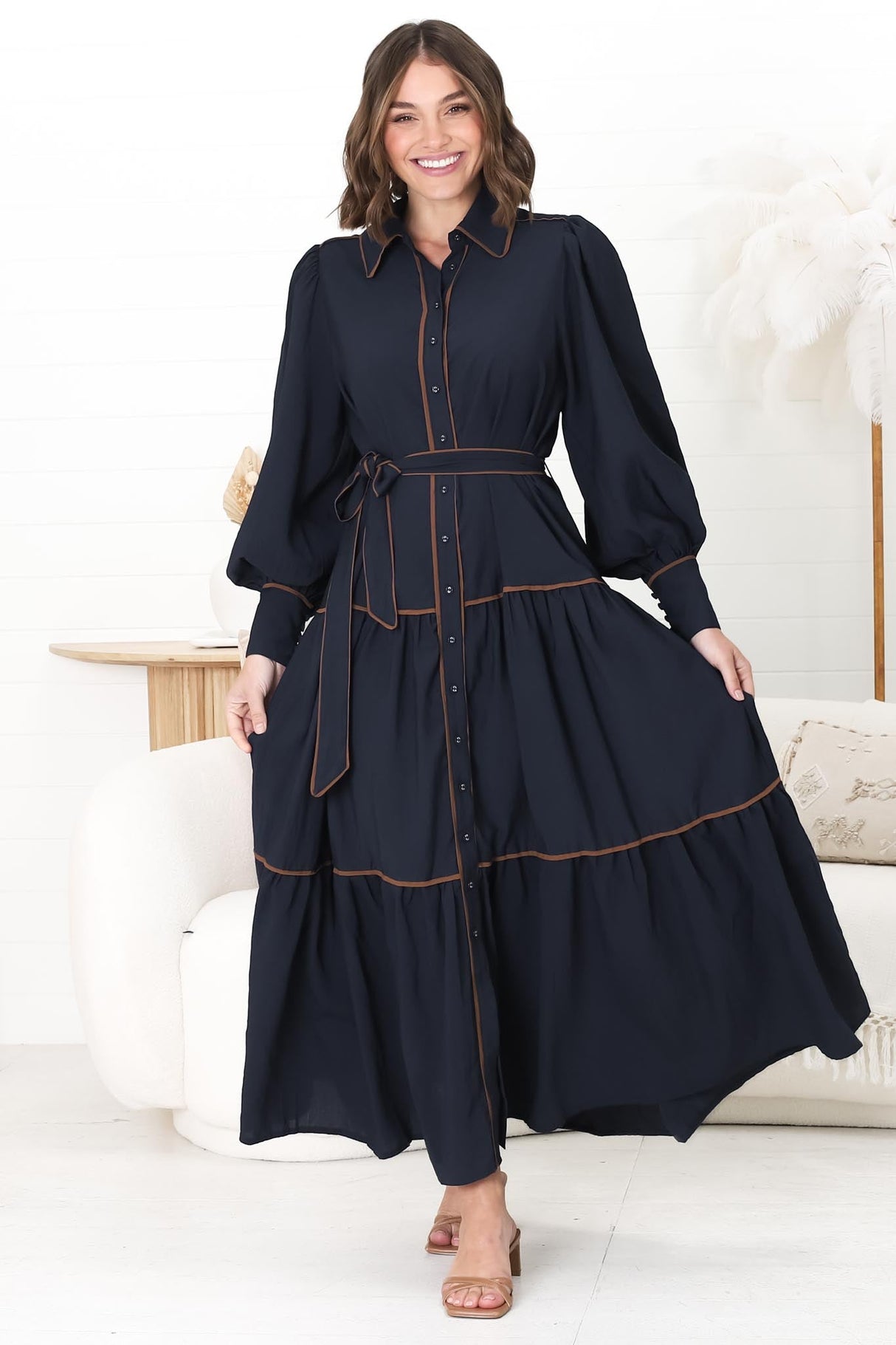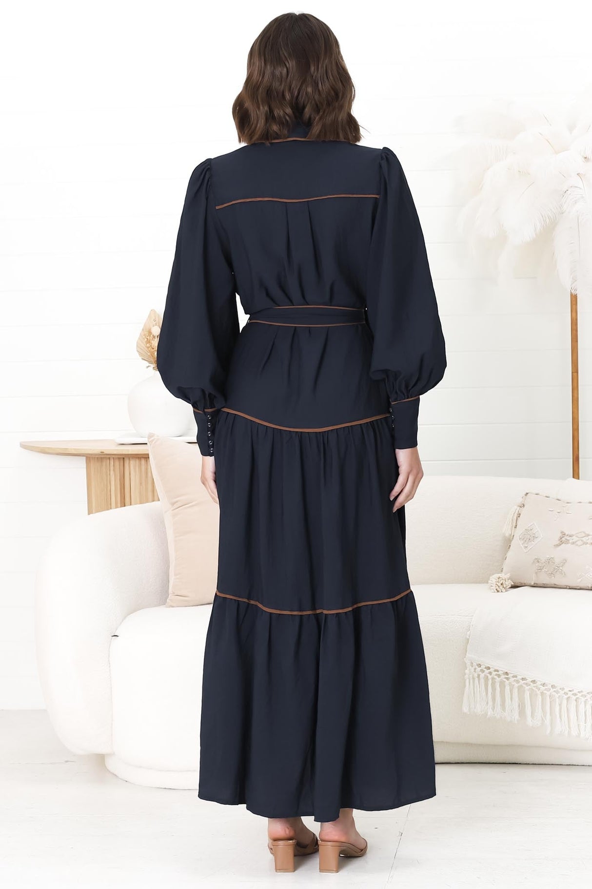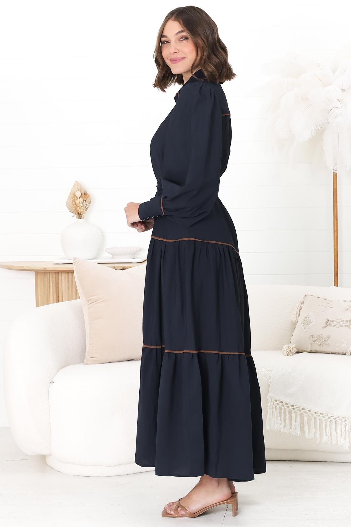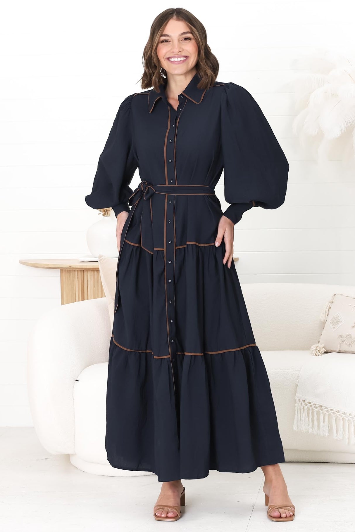 Marise Maxi Dress - A Line Dress with Collared Neckline and Long Sleeves in Navy