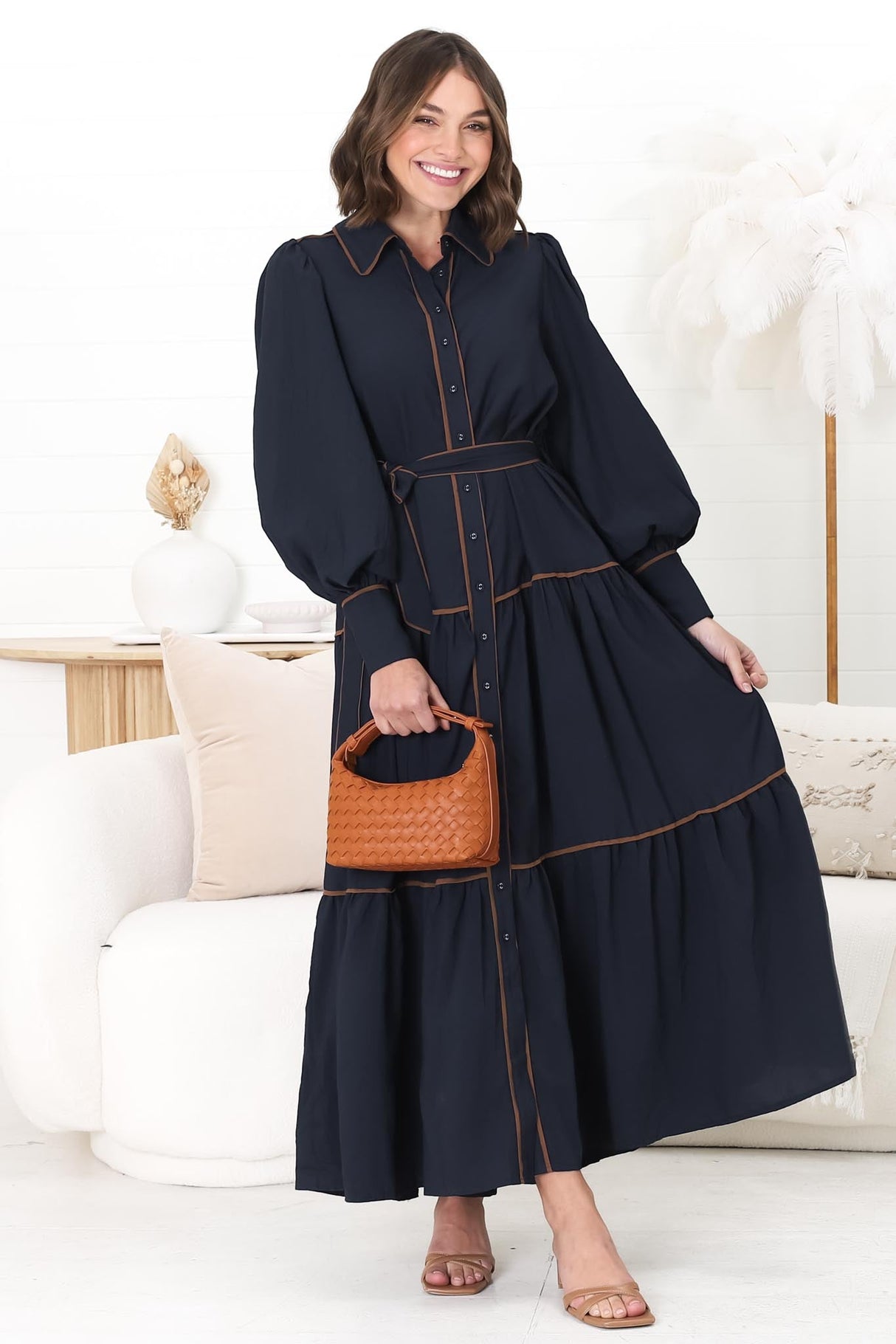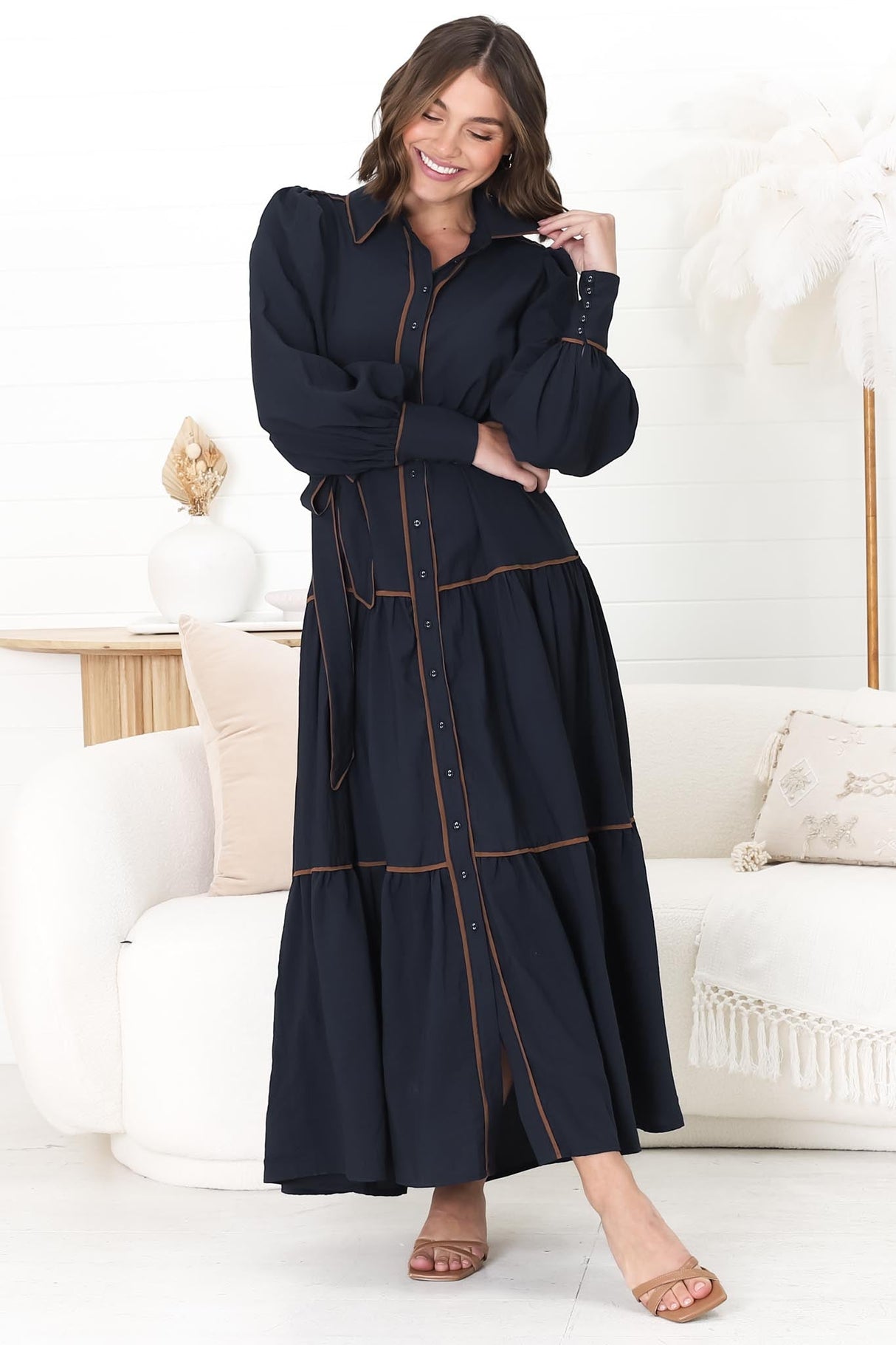 Introducing the Marise Maxi Dress, a stunning blend of elegance and comfort. This captivating a-line maxi dress is designed to turn heads with its chic and timeless details. The dress features a flattering gathered waistline, perfectly complemented by an elasticated back for a custom fit. The long balloon sleeves add a touch of whimsical romance, while the v-neckline offers a hint of allure. The buttoned-down front completes the look with a classic touch. Ideal for any occasion.