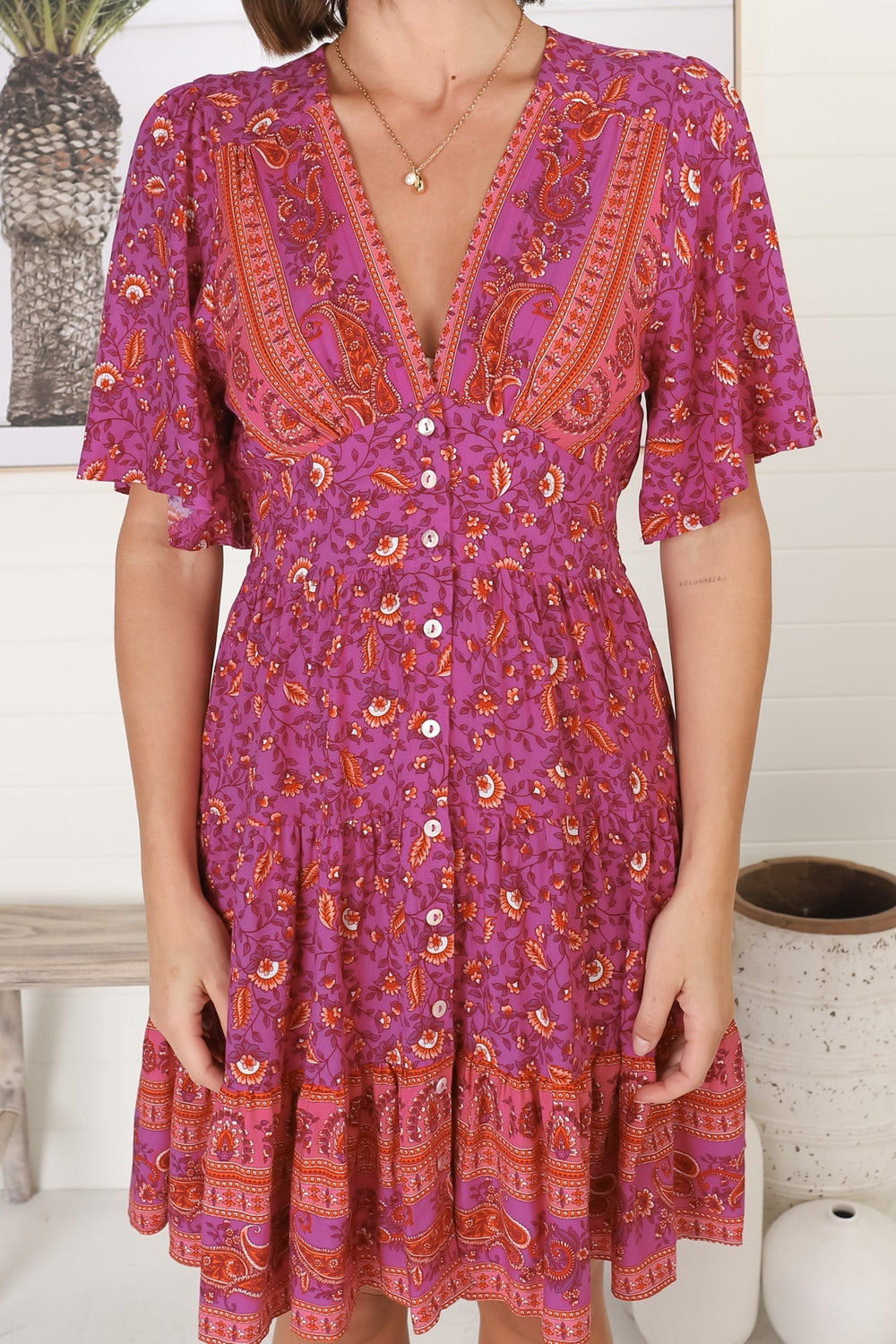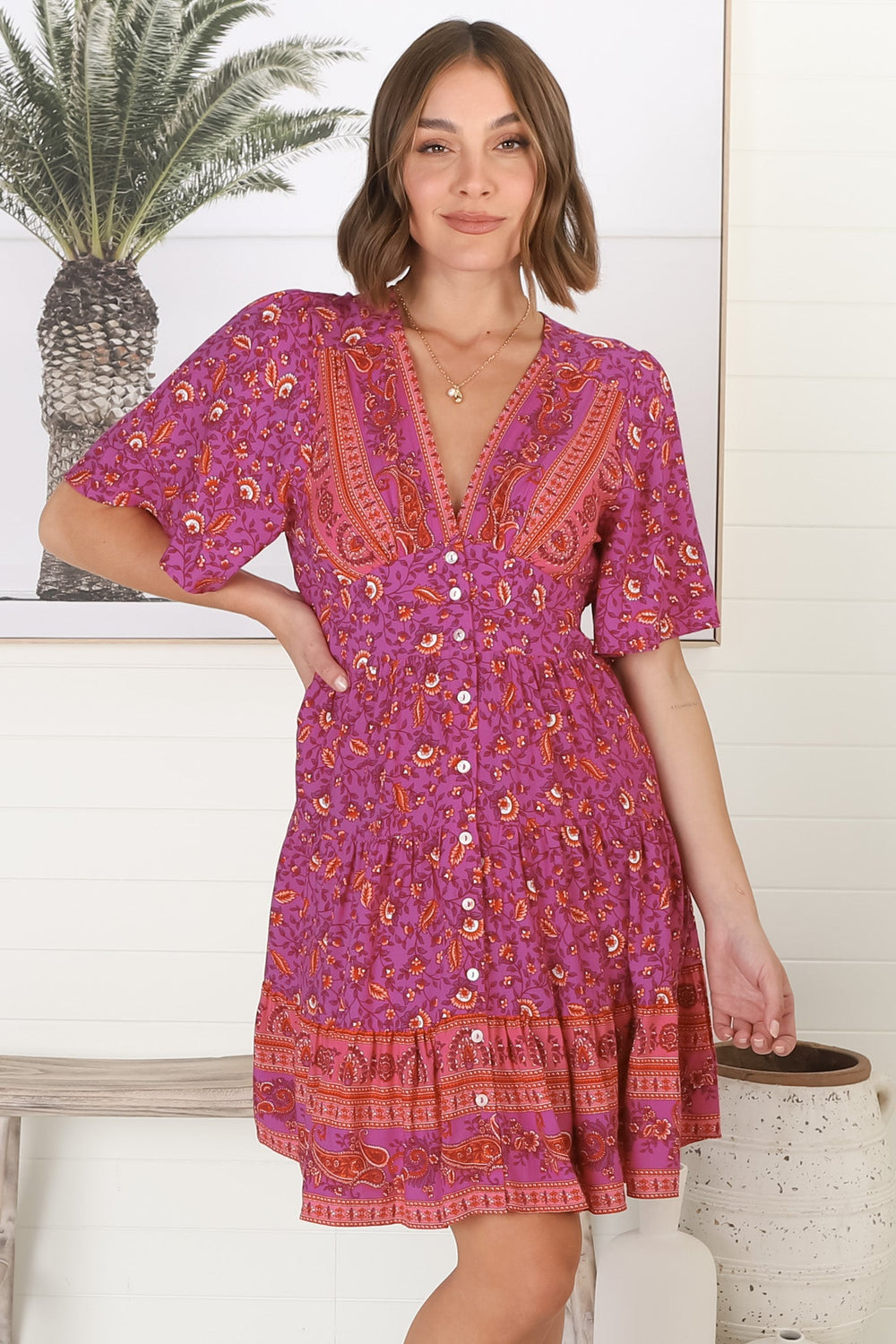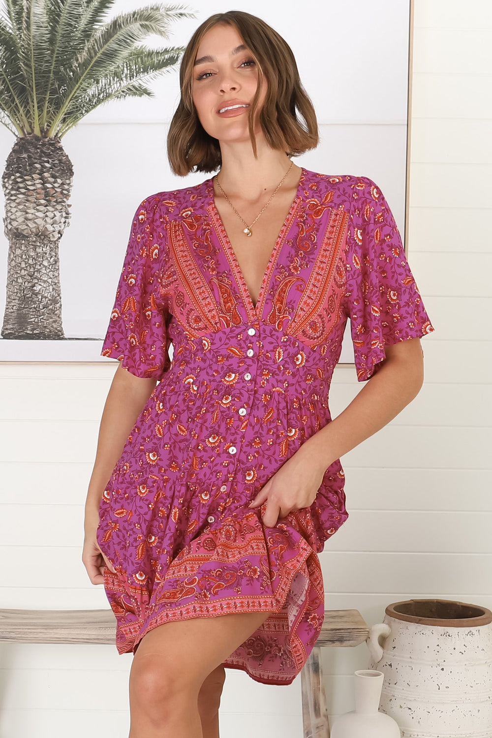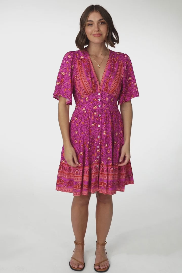 Sana Mini Dress - Bell Sleeve Button Down V Neck Dress in Rosina Print