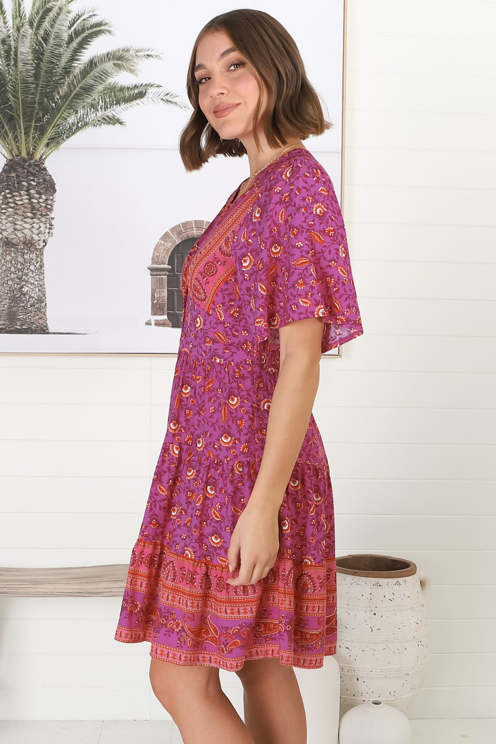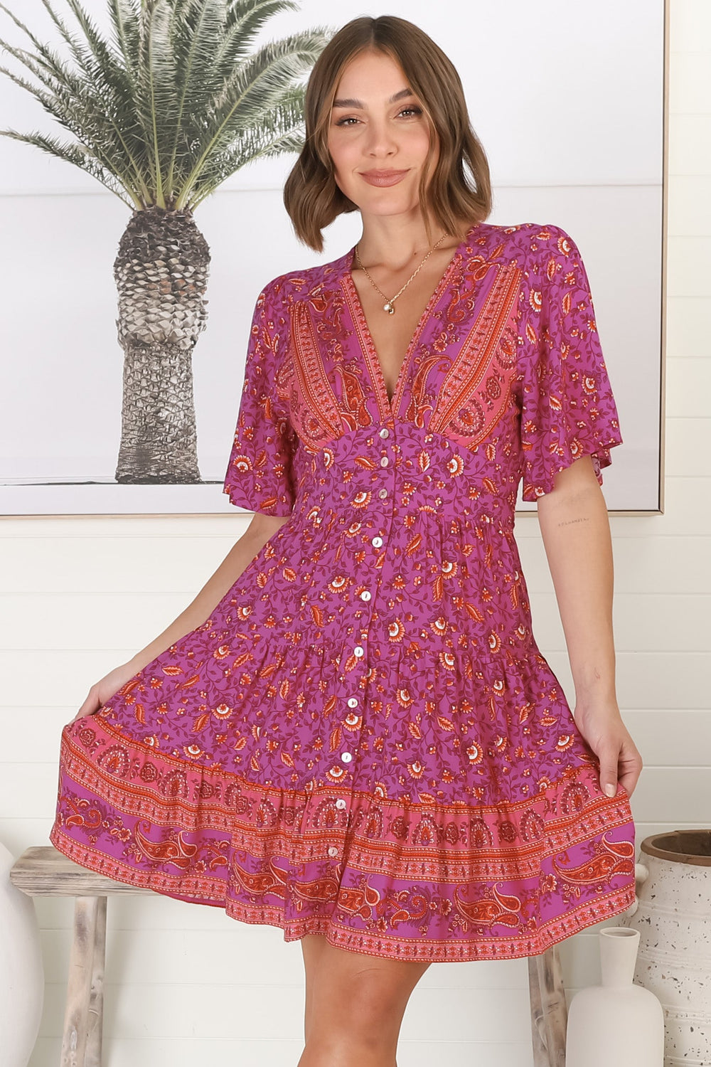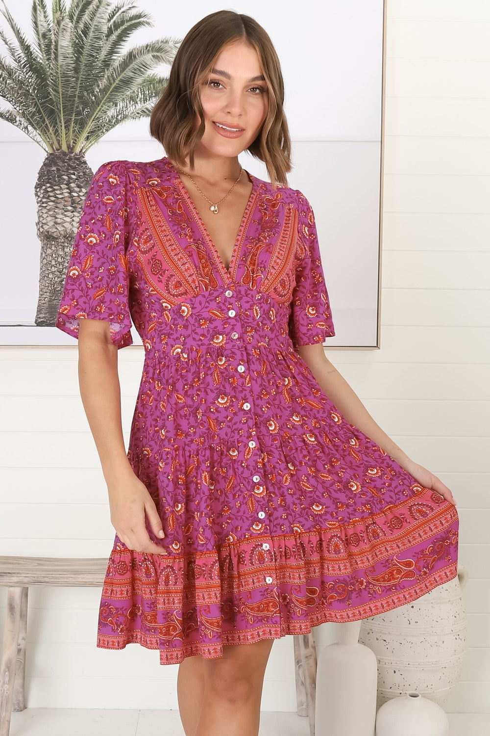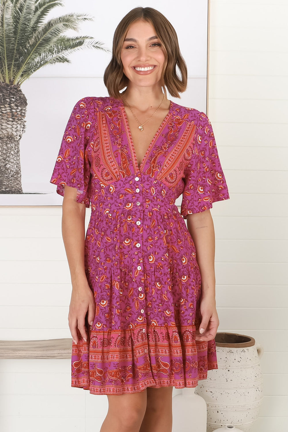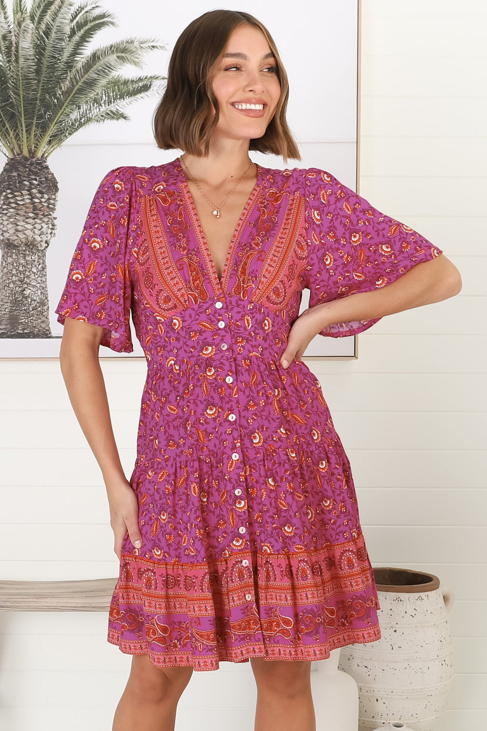Sana Mini Dress - Bell Sleeve Button Down V Neck Dress in Talina Print