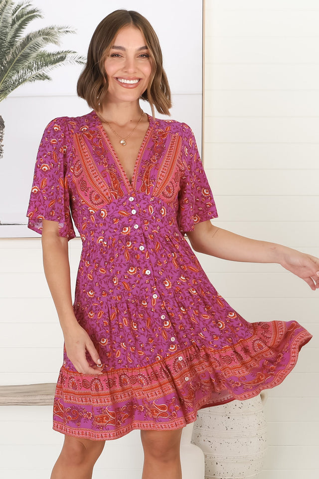 Sana Mini Dress - Bell Sleeve Button Down V Neck Dress in Berry