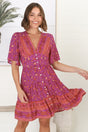 Sana Mini Dress - Bell Sleeve Button Down V Neck Dress in Rosina Print