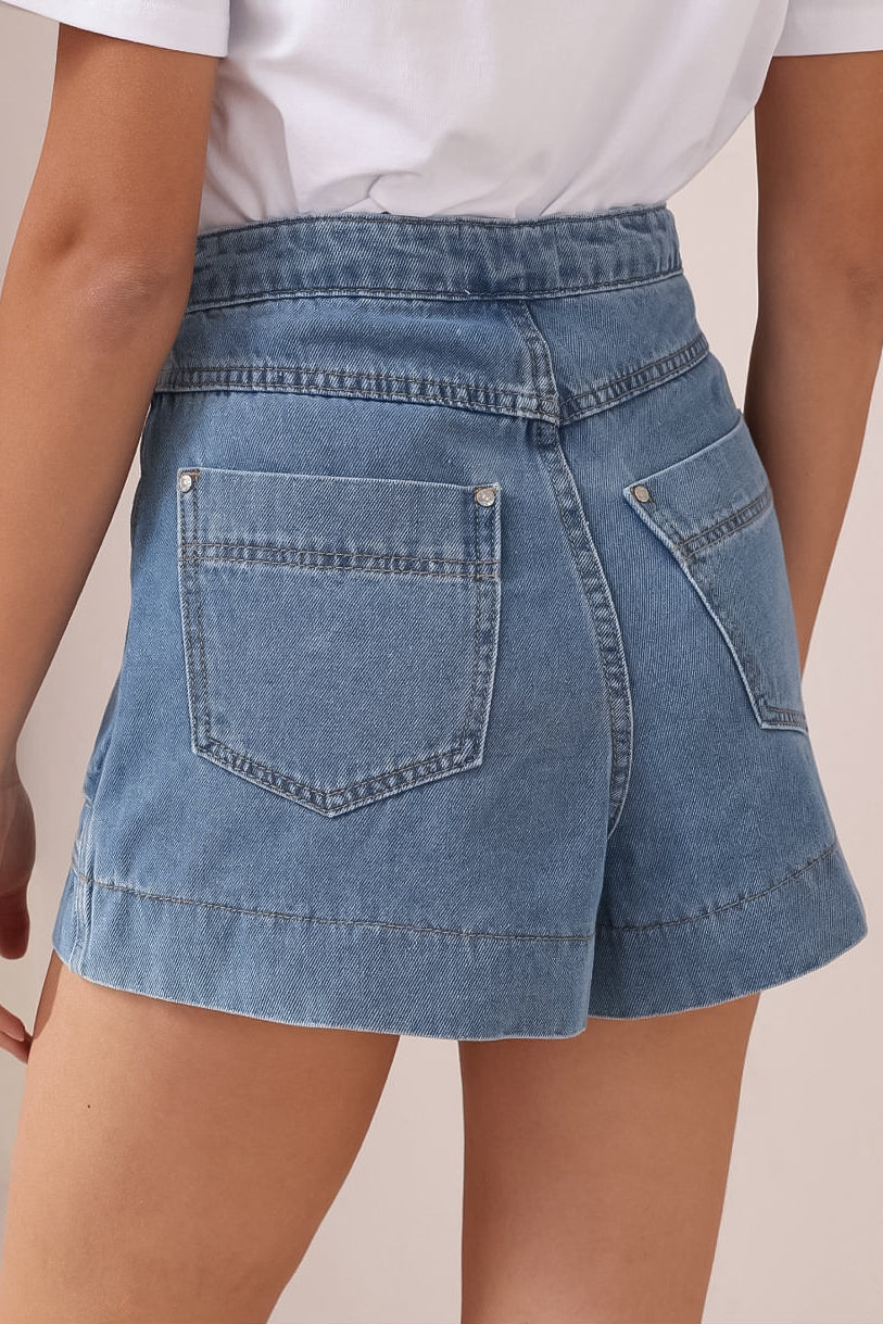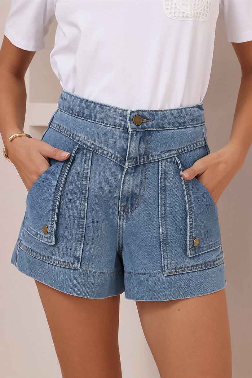 Sullivan Shorts - High Waisted Button Fold Pocket Denim Shorts in Mid Wash Denim