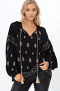 Wrenlow Blouse - Embroidery Mandarin Collar with Neck Tie Pull Over Blouse in Black